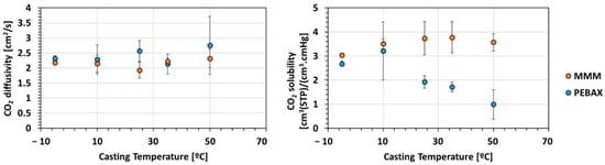 CO2 solubility and diffusivity coefficients were determined. Table S1 summarizes permeability, diffusivity and solubility coefficients. Diffusivity coefficients were calculated from Equation (3), while solubility coefficients were obtained from Equation (4). Figure 9 shows the variation of the diffusivity and solubility with the casting plate temperature for PEBAX and MMMs.