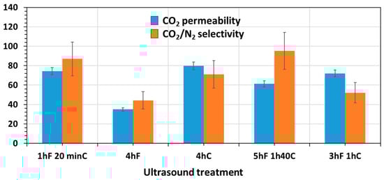CO2 permeability (Blue) and CO2/N2 selectivity (Orange) of MMMs according to the ultrasound treatment. (The large error in the selectivity is due to the large uncertainty in N2 permeability).