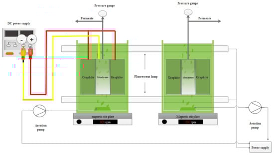 The experiments were conducted using two lab-scale submerged MPBRs. The reactors were filled with 10 L of culture medium. White LED lamps were used to provide illumination. The reactors were put in a magnet stir to mix the algal solution slightly. The schematic diagram of the experimental set-up is shown in Figure 1. Table 2 summarizes the basic parameters of the membrane module and the operating conditions. Two flat sheet rectangular graphite electrodes and two stainless steel meshes were placed in the reactors. The EK-MPBR is connected to a DC power supply system, and the MPBR has the same configuration but without DC power supply. The graphite and stainless steel sheets were connected to positive and negative poles of a DC power supply (B & K precision’s, Taiwan), respectively. A constant DC electric field was applied to the microalgae for the entire operation for the EK-MPBR.
