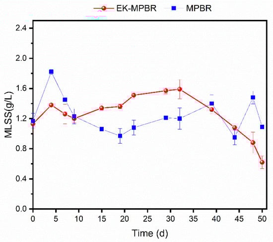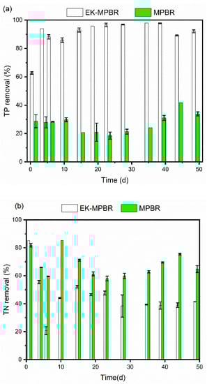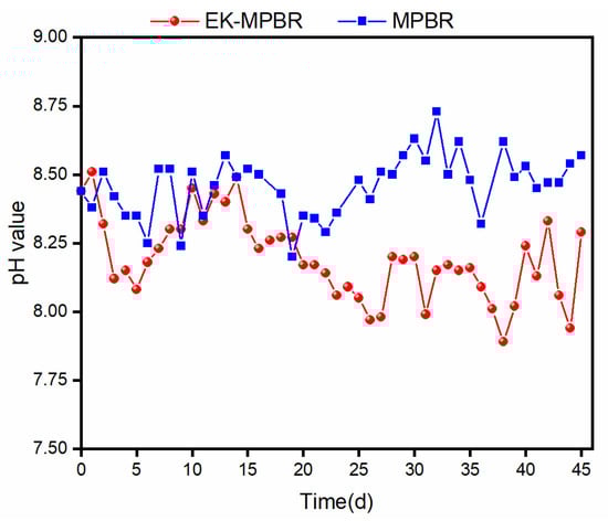 Despite the significant phosphorus removal of EK-MPBR, the nitrogen removal efficiency of EK-MPBR was depressed to some extent. The better phosphorous removal efficiency compared to the nitrogen removal efficiency in EK-MPBR might be because of their different removal mechanisms. At the water-oxide interface, phosphate removal utilizes an inter-sphere adsorption mechanism that is less affected by ionic strength as compared to nitrogen removal, which has an outer-sphere adsorption mechanism []. As shown in Figure 3b, EK-MPBR TN removal ranged from 17.82% to 85%, whereas in control MPBR, TN was removed by 58% to 85% (p < 0.05). The concentration of TN in the influent was kept at a constant value of 25 ± 2 mg/L for both reactors. The lower nitrogen removal efficiency agrees with other studies that showed that the electric field might interfere with the nitrogen removal process [,,]. The fluctuation over the 49 days in TN removal in EK-MPBR could be attributed to the change of MLSS concentration (Figure 3a), zeta potential (Figure 4), and ionic strength of the suspension, which may have interfered with nitrification. The lower nitrogen removal in EK-MPBR due to the presence of an electric field agrees with the study by Zhang et al. []. The potential changes in ionic properties of the microalgae could be due to the electrochemical reactions and the incorporation of the electric field, which further have an inhibitory impact on the removal of total nitrogen []. However, both EK-MPBR and MPBR showed nitrogen removal comparable to other studies (Table 3).