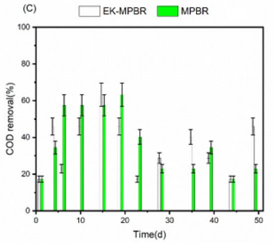 Figure 3c represents the COD concentration over the experimental period. The influent COD concentration for both reactors was kept constant at 20 ± 1.8 mg/L. The COD reduction can be attributed to the thickness of the biofilm, electrochemical oxidation of organic substances, and oxidation of the organic compounds by electrochemically generated oxidants such as hydrogen peroxide []. In this study, due to the induced multiple factors, further investigation is needed before highlighting any underlying reasons as the main mechanism of COD removal in EK-MPBR when comparing it with MPBR.