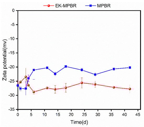 Zeta potential variation during EK-MPBR and MPBR operations.