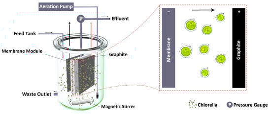 Studies that incorporate electric fields in membrane bioreactors (MBR) have found improved chemical oxygen demand removal (COD) as well as nitrogen and phosphorus removal were observed by applying a short-term electric field in membrane bioreactors (MBR), where activated sludge was used [,,,]. To date, only one study has integrated an electric field into an MBR with algae and activated sludge []. However, the combination of an electric field with a membrane photobioreactor utilizing algae as biomass has not yet been investigated.
