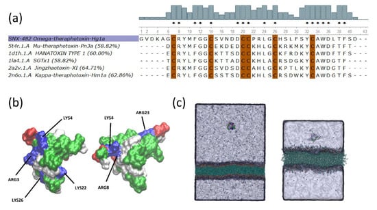 Comparative Modeling SNX-482. (a) Alignments of the five ICK toxins with the highest identity score to SNX-482. Identity score is included for each toxin. SNX-482(Omega-theraphotoxin-Hg1a) is highlighted in purple. Bars at the top of the alignment depict the percent identity at each position of the sequence. Conserved cysteines are highlighted in brown. (*) Identical residues (b) Surface representations of the Jingzhaotoxin-XI (left) and the SNX-482 (right) colored by residue type: positively charged (blue), negatively charged (red), and polar (white), hydrophobic (green). Both toxins’ structures are in the same orientation according to structural alignment. (c) The representative initial simulation system of the CG model (left) and the all-atom setup (right).