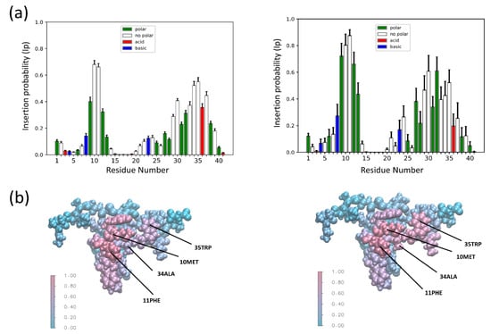 The COM-based calculations may underestimate insertions and miss events where only the side chain falls below the membrane plane. Thus, we computed Ip profiles considering COM of the residues’ side chains (Figure S16) and revealed a slight reduction in Ip for polar and charged residues. IS calculated with this new criterion were virtually identical (Table S3). These restricted Ip measurements were also carried out for the last 0.5 µs of the extended simulation in the 3:1 system (Supplementary Figure S17A). We confirmed a reduction in Ip for polar residues, particularly from the first insertion patch encompassing residues 9 to 12. We also carried out Ip calculations employing a stricter criterion: a residue was considered inserted if it laid below C1 carbon of lipids’ fatty acid chain (Figure S17b). The latter is consistent with polar residues remaining closer to the polar heads while hydrophobic residues will go deeper in the membrane hydrophobic core.