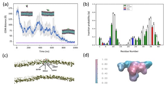 To explore the differences between the CG and AT descriptions in more detail, we computed the average Ip for each residue for all simulations in which there was a successful insertion event, regardless of the membrane composition (Figure 2a). Overlaying color-coded Ip values over a surface representation of SNX-482 allows us to visualize the global binding pose (Figure 2b). These results show that membrane partitioning residues are conserved regardless of membrane composition or resolution in all trajectories with at least one insertion event. We observe a bimodal distribution encompassing similar segments of the amino acid sequence in both cases. The first segment would span from residues 9 to 12 having an Ip > 0.2. Following a similar criterion, the second segment spans 29 to 39. The insertion process was investigated in more detail on simulations with the membrane composition that reported the most significant proportion of insertion events. These correspond to POPC: POPG ratios of 1:1 and 3:1 for CG and AT. The time evolution, average Ip for each residue, and binding pose are shown for these two cases: Figure 3 corresponds to CG simulation and Figure 4 to AT MD. Results for the other membrane compositions are reported in Supplementary Figures S2–S12. In both systems, the toxin comes into close contact with the membrane and reaches a plateau (below 0.5 nm) that remains stable for the final 200 ns of the simulation (Figure 3a and Figure 4a). Note that the system’s volume is larger for CG, and SNX-482 start 12.5 nm away from the membrane in CG in contrast to the 2.5 nm for AT. Consequently, it takes more than 800 ns for the toxin to contact the membrane in CG. During this time, SNX-482 is expected to explore all orientations before insertion, thus not being influenced by the initial pose. Nevertheless, we set different initial poses in each of the four CG simulations. In AT, the time to the first toxin-membrane contact was about 300 ns, more likely influenced by the initial pose. However, the gray area depicted in AT simulation trajectory suggests that even at such a short distance, the initial pose was not a relevant factor in the final configuration of the toxin-membrane complex.