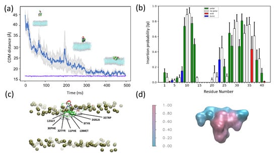 Coarse-grained MD simulations of SNX-482 and POPC: POPG (1:1) (a) Average distance as a function of time between the center of mass (COM) of SNX-482 and the (COM) of the membrane bilayer for four independent simulations. The gray colored region corresponds to the mean error of the distances. The purple line represents the position of the membrane outer leaflet. (b) Average insertion probabilities (Ip) for each residue. (c) Snapshot of membrane embedded toxin labelling residues with high ip (d) Surface representation of SNX-482 colored by Ip.