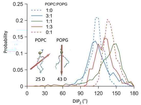 It is seemingly contradictory that electrostatic forces favor the binding of negatively charged SNX-482 to membranes containing anionic lipids. However, because the size of the toxin is relevant, the dipole moment is a more appropriate parameter to understand electrostatic forces. Indeed, as shown in Figure 5, the dipole moment of the bound toxin has a preferred orientation whose angle increases with the ratio of POPG, whose dipole orientation is perpendicular to the membrane plane and points to the interior. Thus, electrostatic forces would help align SNX-482 and POPG dipoles while the optimal orientation for membrane insertion falls around 100–120°.