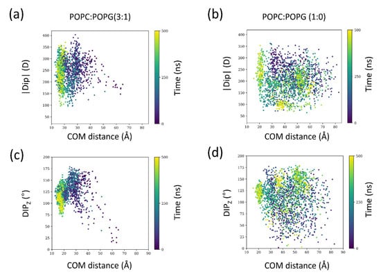 Dipolar interactions as a function of membrane distance. (a) dipole magnitude (|Dip|) and (c) dipole angle (Dipz) to the z-axis of SNX-482 for the 3:1 system. (b) dipole magnitude and (d) dipole angle with respect to the positive z-axis of SNX-482 for the 1:0 system. Points are colored according to the time in the simulation. In each condition, data from all four simulations were included. The data was obtained from the four unrestrained AT simulations displaying spontaneous binding simulations.