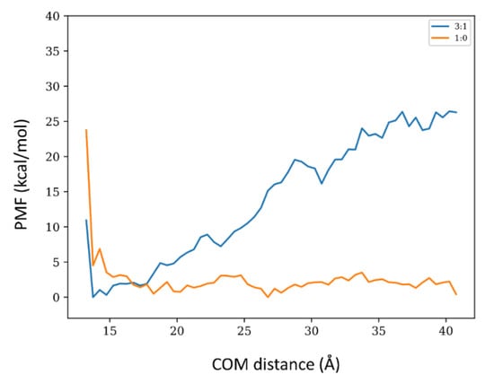 Potential of Mean Force (PMF) calculations were carried out with the NAMD v2.14 software [29] employing well-tempered meta-dynamics [32,33] and the Colvar module of NAMD [34], in which a time-dependent potential (Vt+dt) is applied on a collective variable (Cv) with the following formulation: