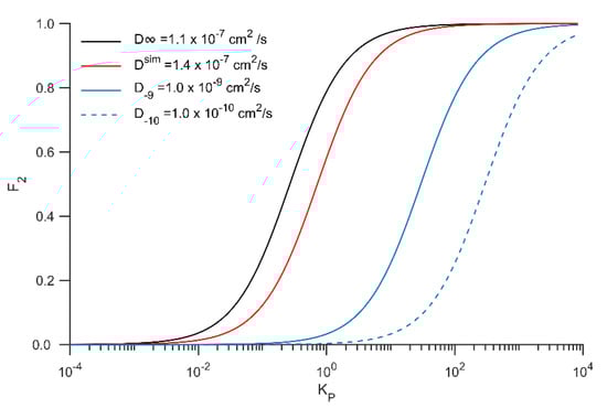 where σ and χ are the Brownian persistence distance (free path between collisions) and the fraction of collisions that lead to binding. For simplicity, we assume that these parameters are the same in bulk (σ3 and χ3) and membrane-bound (σ2 and χ2). Ra is the capture radius, which is in the order of nanometers. D2 and D3 are the toxin’s diffusion constants membrane-bound or free in solution, respectively. KP is the partition coefficient between the membrane and bulk phases. Axelrod and Wang’s [10] original formulation was expressed in terms of absorption constant (Kads), being the quotient between surface (mol/cm2) and bulk (mol/cm3) concentration, it has units of cm−1. Assuming that all toxin remains on the surface in the membrane phase, Kp = (SA:V)Kads being SA:V the surface area to volume ratio, a parameter that strongly depends on size and geometry. At the microscale and in perfect spherical geometry, SA:V is in the order of 106 cm−1. Inspection of Equation (4) shows that F2 increases with KP and D2. Figure 8 illustrates how these two variables influence F2. For the diffusion constants obtained in this work (D∞ and Dsim), the RD mechanism is clearly the dominant process even for KP near unity. We also estimated F2 for diffusion constants of 10−9 and 10−10 cm2/s that displace the curves to the right. In such cases, F2 approaches one when KP > 1000. Some final points are worth mentioning: two parameters were defined as equal in the bulk and within the membrane; σ depends on the viscosity of the medium and should be more prominent within the membrane, thus reducing F2; χ may also increase in 2D given the reduced sampling space for random collisions, thus augmenting F2. Notwithstanding, it is reasonable to assume that apart from partially canceling each other in Equation (7), these factors will likely not differ by more than an order of magnitude with respect to bulk conditions. Finally, this model assumes that binding occurs with a low probability per collision as when a kinetic barrier for binding exists, as it is often the case in protein-ligand binding phenomena.