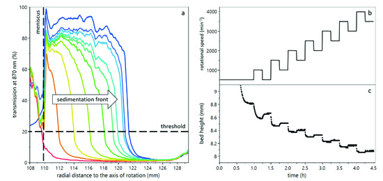 Working principle and set centrifugation steps during analytical centrifugation. The transmission of light as a function of radial position can be used to determine the sediment bed height (a). The rotational speed was increased stepwise with relaxation steps between (b) in order to determine compressibility as well as relaxation of the sediment in terms of the sediment bed height (c).