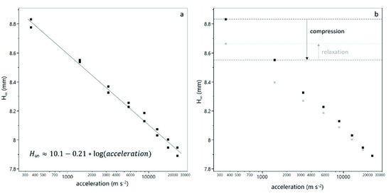 Equilibrium sediment bed height as a function of the centrifugal acceleration. The decreasing bed height with increasing acceleration can be fitted as a semi-logarithmic function for each duplicate measurement (a). After a step with reduced acceleration, the sediment bed height increases, which indicates a relaxation of the sediment (b). The black dots refer to values obtained from compression steps and grey dots to values obtained from decompression steps. The ratio of relaxation to compression is used to calculate the relaxation factor according to Equation (4).