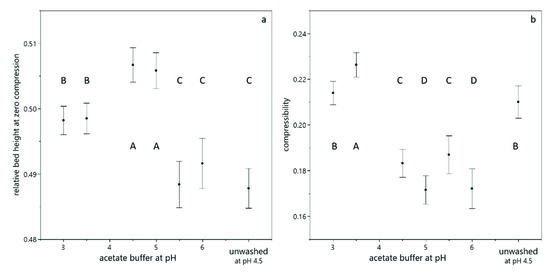 Compression behavior of yeast suspensions, calculated according to Equation (3). The relative bed height at zero compression (a) and the compressibility upon centrifugal acceleration (b) as a function of the buffer and its pH value. The error bars indicate the standard deviation from fitting the model equation. The connecting letters are obtained from a student’s t-test with a 95% confidence interval.