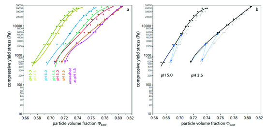 In order to combine the bed height at zero compression and the compressibility with increasing acceleration, the particle volume fraction in the sediment (according to Equation (5)) can be determined for the different suspensions as a function of the compressive yield stress (according to Equation (7)). It can be seen in Figure 4 that the particle volume fraction in the sediment is highest for the unwashed yeast suspension, followed by suspensions with a low pH value, close to the isoelectric point. The lowest particle volume fraction in the sediment was found for pH 4.5 and pH 5.0, where the relative bed height at zero compression was high and the respective compressibility low. At pH 5.5 and pH 6.0, the compression was low as well, but the relative bed height at zero compression was also little, which results in a higher particle volume fraction in the sediment in comparison to suspensions at pH 4.5 and pH 5.0.
