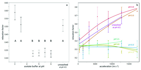 Relaxation behavior during analytical centrifugation of yeast suspensions. The mean relaxation factor depends on the buffer pH (a). The error bars indicate the standard error over all values from different centrifugal acceleration and a duplicate measurement. The connecting letters are obtained from a student’s t-test with a 95% confidence interval. For sediments in the connecting letter group (A), the relaxation factor depends on the centrifugal acceleration, as shown in (b).