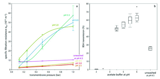 In order to better assess the correlation between sediment formation in the analytical centrifuge and deposit layer formation during filtration, dead-end filtration trials were conducted. The yeast suspension was supplemented with BSA as a model protein. By means of BSA, the effect of deposit formation on the transmission of solutes was assessed as filtration efficiency criterion besides the filtration resistance and deeper insights regarding the structure and retentive effect of deposited cells was derived. Dead-end filtration trials were conducted at different transmembrane pressures (in a similar range as the compressive forces in the analytical centrifuge) and different buffer pH values for washed and unwashed yeast cells. All experiments were conducted with 5 and 10% dry matter content, but the results were alike. The specific filtration resistance for duplicate trials is shown in Figure 6a. Firstly, it can be seen that the resistance at lower pH was significantly lower than at high pH, and increased less with increasing transmembrane pressure. This is in accordance with literature [12,20], but contradictory to the findings from analytical centrifugation, which showed a high compressibility at low pH value. This discrepancy might be attributed to the presence of BSA, as discussed below (see Figure 8). The very pronounced difference between pH 4.5 and pH 5.0 can also be attributed to BSA. The isoelectric point of BSA is at pH 4.7, i.e., between the two experimental settings. Thus, at pH 4.5, BSA is slightly positively charged and interacts with negatively charged yeast cells, leading to a different deposit layer structure than at pH 5.0, where both BSA and yeast cells are negatively charged. Secondly, the resistance for unwashed yeast cells was significantly higher than for washed yeast cells at the same pH value, which is in accordance with literature [21] and also with findings from analytical centrifugation (see Figure 3 and Figure 4).