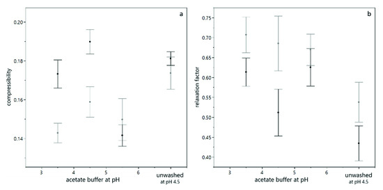 In order to quantify the reversibility of compression, the relaxation factor was calculated according to Equation (4). Figure 5a shows the relaxation behavior for suspensions prepared with different buffers. It can be seen that the relaxation factor at low pH value and for unwashed yeast cells was higher than for suspensions at pH between 4.5 and 6.0. Figure 4b illustrates this difference in the compressive yield stress as a function of particle volume fraction for two different pH values. It is evident that at pH 3.5, the reversibility is higher than at pH 5.0, where the particle volume fraction decreases only slightly at reduced levels of centrifugal acceleration. From Figure 4b it also becomes clear that the particle volume fraction in the sediment of the suspension at pH 3.5 is above 0.74, which is considered as the densest packing density for spheres. In order to reach those high packing densities deformation of the cells is necessary. This deformation provokes a strong counterforce, which enables relaxation [28]. The fact that for sediments with high particle volume fractions the relaxation factor increases with increasing acceleration while it is independent for sediments with lower particle volume fractions (see Figure 5b) corroborates this hypothesis. The partial relaxation observed for yeast-only suspensions is in line with the reversibility of deposit layers from yeast cells observed during dead-end filtration by Ye and Chen [12].
