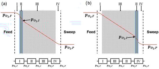 Please note that in these simulations the pressures and molar fraction always represent those directly at the membrane surface, i.e., , , and , according to Figure 1. However, in permeation experiments, in most cases only the upstream or downstream values are accessible. Only a few attempts are reported to measure close to the membrane surface [31,32,33]. In particular, using high-performing membranes leads to considerable concentration polarization in the gas phases, i.e., oxygen depletion and accumulation at the feed and permeate sides, respectively, and thus, . This should be carefully addressed in future, e.g., by implementing the model approach described here in a computational fluid dynamics (CFD) simulation environment.