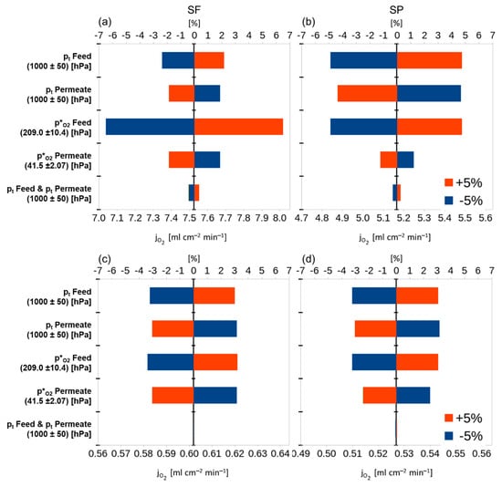 Sensitivity analysis: effect of varying single parameters by ±5% of their original value on the total result of the calculated result. Upper scale: percentage deviation of the original flux. Lower scale: fluxes calculated with the given values from Table 1. (a) BSCF support on feed side (SF), (b) BSCF support on permeate side (SP), (c) STF SF, (d) STF SP.