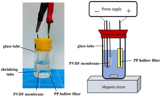 A schematic diagram of the EME setup is illustrated in Figure 1. A glass vial (15 mL) was employed as the sample compartment. A glass tube with an internal diameter of 3.3 mm (48 mm height) was fixed to the left side of a rubber cap. A 4.7 mm diameter PVDF membrane with a thickness of 200 μm and a pore size of 0.22 μm was cut and fixed to the side of the glass tube by a heat shrinking tube. A 3.0 cm piece of PP hollow fiber with a thickness of 200 μm and a pore size of 0.22 μm (diameter 3.0 mm) was dipped in NPOE for 10 s and served as the SLM. Subsequently, 50 μL of 10 mM TFA was injected into the lumen of the hollow fiber with a microsyringe. The hollow fiber containing SLM was inserted through a hole on the right side of the rubber cap of the sample compartment. Two platinum wires (diameter 0.5 mm and length 6.8 cm) were used as electrodes with an interelectrode distance of 1.5 cm. The cathode and anode were placed into the lumen of the hollow fiber and glass tube, respectively, and connected to the DC power supply (P-200, Hila International Inc., Hsinchu, Taiwan) with a variable voltage in the range of 0–200 V. The EME system current was converted to voltage by a 1 kΩ resistor. Current measurements were recorded with a computer connected to the Peak-ABC chromatographic data handling system (Great Tide Instrument Company, Taipei, Taiwan).