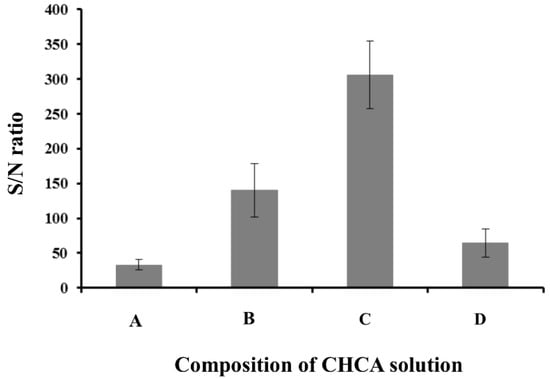 Effect of CHCA solution composition on the S/N ratio of posaconazole. CHCA solution in 0.1% aqueous TFA contained (A) 30% acetonitrile, (B) 30% methanol, (C) 50% methanol, and (D) 70% methanol. Experimental conditions: sample volume, 3 μL; CHCA solution volume, 3 μL; and posaconazole concentration, 1.00 μM. A total of 200 pulsed laser shots were applied using a laser adjusted to energy levels that slightly exceeded the threshold.