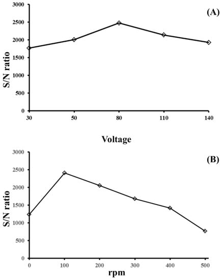 Different experimental factors were studied to optimize the efficiency of the extraction procedure. Each data point was calculated by averaging the S/N ratio of 21 sample spots (three samples). The applied voltage was investigated in the range of 30 to 140 V at an extraction time of 5 min. As shown in Figure 3A, the posaconazole S/N ratio increased when the applied voltage increased from 30 to 80 V. A further increase from 80 to 140 V showed a decrease in the S/N ratio. When the voltage was increased, the system current increased, which led to unwanted electrolysis at the electrode and caused the extraction efficiency to decrease. Thus, an applied voltage of 80 V was used in the following experiments.