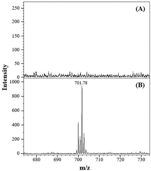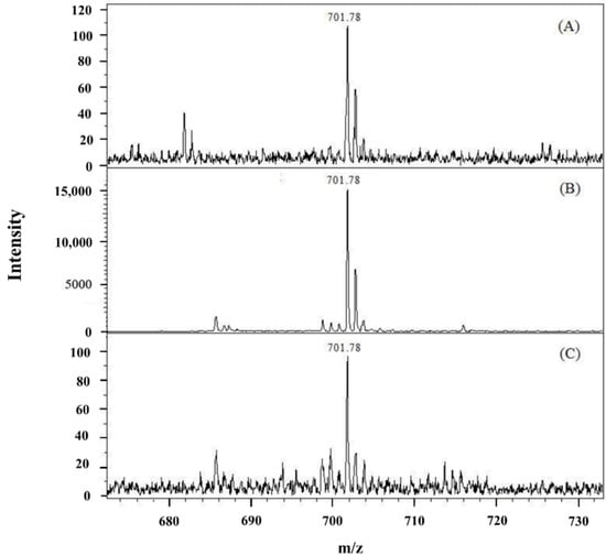 To evaluate the applicability of this method for biological and clinical analyses, human serum spiked with posaconazole was used as test samples. Because of the high protein content, deproteinization of the serum samples prior to EME was required. Then, one milliliter of the serum sample was diluted to 8 mL with the 10 mM TFA solution and treated using the EME technique with the above procedure. A direct analysis (without EME) of the posaconazole-spiked serum sample was performed. No posaconazole ions were detected without EME, as shown in Figure 7A. Samples from biological sources often contain high salt concentrations, and the presence of these salts significantly suppresses the analyte signals in MALDI/MS. When using EME to extract posaconazole from the posaconazole-spiked serum sample, posaconazole was detected in the mass spectrum (Figure 7B). The signal at m/z = 701.78 corresponded to the protonated ions of posaconazole. The calibration curve showed good linearity over the concentration range of 0.24–16.00 μM with a correlation coefficient (r) of 0.9986 for posaconazole in serum. The LOD for posaconazole in serum was calculated to be 0.07 μM. The linear range of posaconazole sufficiently covered the therapeutic concentration range encountered in serum (0.71 to 1.70 μM) [33].