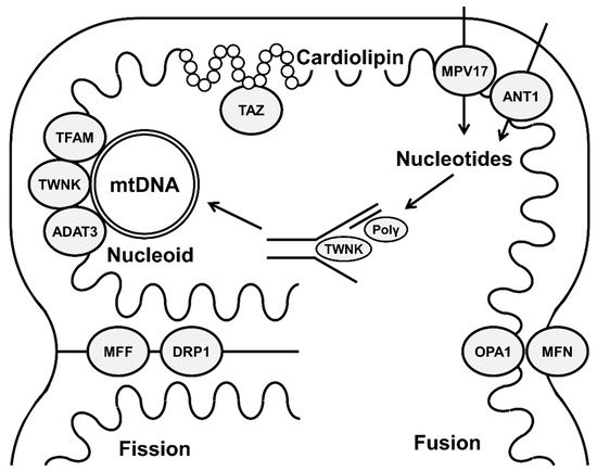 Unlike other organelles, the mitochondria contain their own DNA, the mitochondrial DNA (mtDNA). MtDNA is maternally inherited [6] and each cell contains several hundreds to thousands of copies of mtDNA, depending on the cell type [7]. MtDNA is maintained by a group of nuclear-encoded proteins that are involved in mtDNA replication and repair. These nuclear-encoded proteins are either components of the mtDNA replisome itself or perform other functions essential for mtDNA synthesis, such as supply of deoxynucleotide triphosphates (dNTPs) and mediating mitochondrial fission and fusion [8]. Mitochondrial membranes have direct interaction with mtDNA, and are therefore involved in mtDNA maintenance in several aspects, including organizing the mitochondrial genome, facilitating mitochondrial dynamics, and controlling the mitochondrial nucleotides pool [9,10,11].