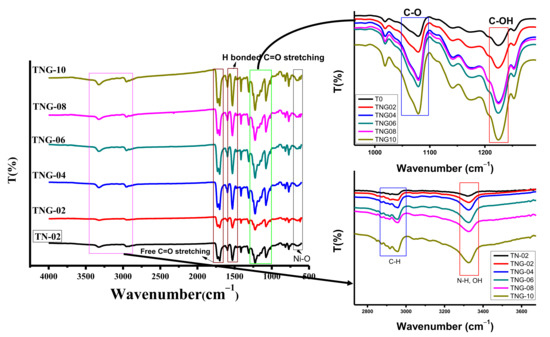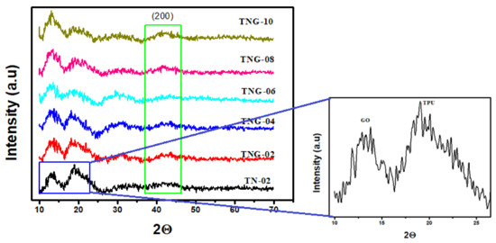 Figure 2 presents the XRD analysis of all NiO/NH2-GO/TPU membranes. A broad peak at 11°–15° is ascribed to GO in membranes and a broad peak at 15°–23° denotes TPU. Slight variations in peak intensities have been observed in different composite membranes. The higher graphene oxide content results in a little reduction of the TPU peak intensity. However, in the best combination, i.e., TNG-08 the peak intensities are comparable. This could be the result of the restriction in the PU chain movement due to a good interaction between TPU and the GO matrix [35,36]. Therefore, TNG-08 instead of TNG-10 can be chosen as the best possible TPU based membrane combination for effective implementation in any field of study. Besides, crystal planes attributed to the NiO are present, and peak intensities seem to be suppressed due to various interactions with composite membranes. However, the strong peak at 2 theta values of 44° (200) confirms the presence of NiO NPs in all membranes [37].
