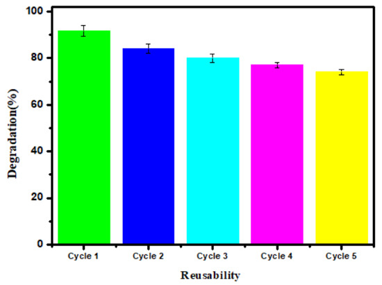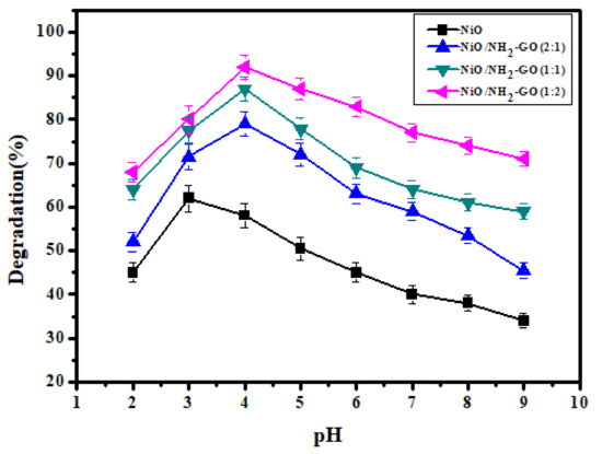 The pH of the solution is one of the influential parameters that affect the degradation of pollutants during the adsorption process. Figure 5 illustrates that the pH of the solution has a significant effect on MO degradation. The pH of the solution affects the surface functional groups of catalysts and the degree of ionization of contaminants. Therefore, the pH of the dye solution was varied from 2 to 9 by using 0.1 M NaOH and HCl solutions. The results showed that at an acidic pH, all the catalysts showed effective degradation. The effective photocatalytic degradation behavior under acidic conditions could be explained based on a point zero charge (pzc) on the surface of metal oxide intercalated aminated graphene oxide nanocomposites. It has been previously reported that the pHpzc on the surface of metal oxide intercalated aminated graphene oxide was 8.2 [39]. At a solution pH > pHpzc, the surface of the adsorbent becomes negatively charged, and at pH < pHpzc, the surface becomes positively charged [40]. The MO dye is an anionic pollutant, which favors an adsorption process under acidic conditions. It means at below 8.2 or near it, the adsorption of MO is a favorable process. The effective adsorption (between adsorbate (dye) and adsorbent (NiO/NH2-GO)) is mandatory for photocatalysis [41,42]. Therefore, pH 4 was the best solution environment for effective adsorption of dye molecules on a catalyst surface as best efficiency was achieved at pH 4 in the case of aminated GO based NiO nanocomposites. At a higher pH, besides the surface charge, another important factor that causes a reduction in degradation efficiency is the scavenging of OH radicals by OH ions (form base). The scavenging of potential radicals means less availability for dye degradation [43].