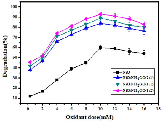 Figure 6. Effect of oxidant dose on photocatalytic degradation of MO using NiO and its composites with NH2-GO (reaction conditions = MO = 25 ppm, pH = 3 for NiO, NH2-GO, and NiO/NH2-GO92:1) and pH = 4 for other composites, light source = UV 254 nm, H2O2 = 10 mM).