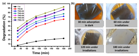 The effective implementation of a chemical process is strongly linked to the reaction time required to achieve desirable results. Therefore, the reaction time for photocatalytic dye degradation using composite membranes was optimized. Different time intervals, i.e., 20–180 min was selected for photocatalysis reaction. The aliquots were collected after sequential time gaps and percentage degradation was assessed for a specific time (Figure 7). The results showed that in the beginning, the photocatalytic dye degradation rate was higher, and it reached a maximum at approximately 180 min under UV irradiation. Besides, the photocatalytic potential of TPU alone is insignificant as compared to the composite membranes containing NiO/NH2-GO. The effective dye degradation was attributed to the enhanced charge immobilization in NiO NPs when aminated GO was incorporated. The best combination for the current study was found to be TNG-08, as shown in Figure 7. Figure 7b contains the MO dye with the TNG-08 membrane. The results showed successive removal of the MO dye with the passage of time. After 180 min of reaction time, almost 95% of the MO had been degraded under UV irradiation, with the optimized condition of other parameters.