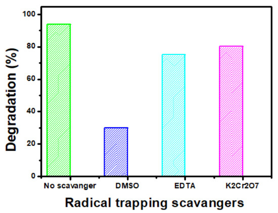 In photocatalytic degradation, reactive species, i.e., hydroxyl radicals (HO); holes (h+); and electrons (e) play key roles. To estimate the most effective radicals in this study, a radical trapping experiment was performed. Each scavenger, DMSO for OH, EDTA for holes, and K2Cr2O7 for electron trapping, was utilized in a 10 mM concentration under optimized reaction conditions [50]. The findings showed (Figure 9) that DMSO is the primary scavenger in the photocatalytic degradation process. Using a NiO-NH2-GO-4 (0.8% of membrane) photocatalytic membrane, the degradation values dropped dramatically from 94% percent to 30%, when DMSO was added. While, with the add-on of EDTA and K2Cr2O7, no effective decrease in dye degradation was examined as the degradation percentage changed from 94 to 73% and 80%, respectively. Therefore, hydroxyl radicals were found to be the key radical for MO dye degradation.