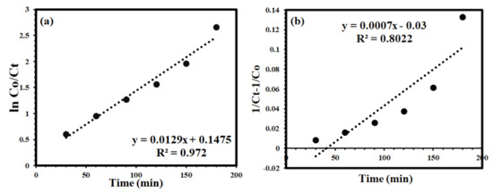 Herein, first- and second-order reaction kinetic models were chosen to analyze the dye degradation process. The expression for both kinetic models is presented in Equations (6) and (7), respectively. K1 is the kinetic rate constant for the first-order model and K2 is the kinetic rate constant for the second-order kinetic model, respectively.