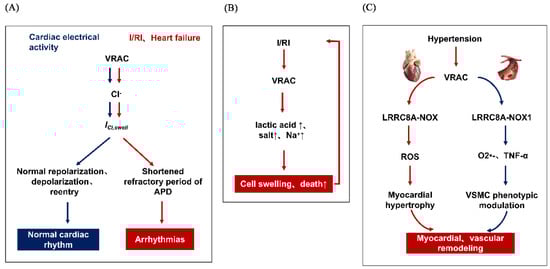 The role of VRAC in several cardiovascular diseases, (A) VRAC and arrhythmias, the blue part represents normal electrical activity of the heart, (B) VRAC and myocardial ischemic disease, (C) VRAC and cardiovascular remodeling, including the myocardial remodeling(red part) and vascular remodeling(blue part).