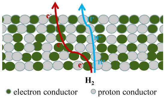 For single-phase MPEC membranes, the relatively low electronic conductivity limits their hydrogen permeability. In dual-phase membranes, proton conductor is combined with electronic conductors with high electronic conductivity, and separate transport channels for protons and electrons are formed inside the membrane (Figure 2). Therefore, compared with single-phase membranes, dual-phase membranes are expected to have higher ambipolar conductivity and higher hydrogen permeability.