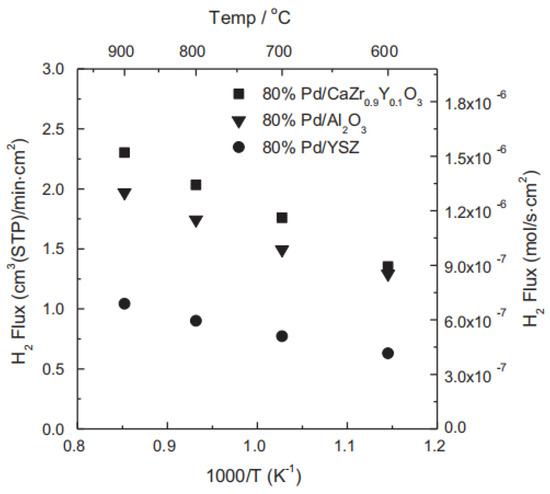 where σi is the partial conductivity of and e′, x is the volume fraction of CZY, L, F, and Φ are membrane thickness, Faraday constant, and hydrogen permeability of Pd respectively. The experiment results showed that the hydrogen flux of Pd-CZY had remarkable enhancement compared with that of Pd-YSZ and Pd-Al2O3 (Figure 3), and the flux ascribing to the ambipolar diffusion of CZY accounted for about 30% of the total flux. The combination of Pd and proton conductor is an efficient method to prepare cermet hydrogen permeation membranes. The study exhibited BaCeO3-based perovskite oxides possessed the highest protonic conductivity among all types of protonic conductors; based on this, Tsai et al. reported a cermet membrane composed of Pd and perovskite oxide-BaCe0.4Zr0.4Gd0.1Dy0.1O3-x (BCZGD) [35], and the membrane had a higher hydrogen permeability than the Pd-CZY system. At 700 °C, the flux of the membrane with 400 µm thickness reached 1.25 mL·min−1·cm−2. Several representative cermet dual-phase membranes and their hydrogen permeation performances are listed in Table 1.