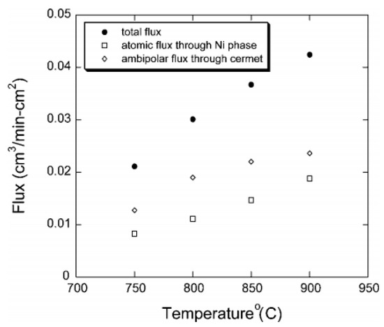 The content of the metal phase in the composites is closely associated with the hydrogen permeability. To gain high hydrogen permeability, the amount of the metal phase needed in the composites should be firstly ascertained. Kim et al. studied the effect of membrane composition on the membrane electrical conductivity and hydrogen permeability [48]. The results showed that only when the Ni content reached 40 vol%, the metal phase could form a three-dimensional network and cause sufficient Ni connectivity. The membrane containing 40 vol% Ni had higher electrical conductivity and H2 permeability compared with the membranes with 30 and 35 vol% Ni. As shown in Table 1, Ni content in most of the current Ni-based dual-phase membranes was set to 40 vol%. Song et al. prepared cermet composite Ni-SrCe0.8Yb0.2O3-x (Ni-SCYb) containing 40 vol% Ni via ball-milling method. Both the membrane electronic conductivity and surface exchange kinetics were improved distinctly. The hydrogen flux was ten times that of single SCYb membrane. Hydrogen permeation due to the atomic diffusion through Ni phase was also detected (Figure 4). However, compared with Pd-based composite membranes, the atomic hydrogen diffusion of Ni is much weaker, and the ambipolar diffusion of SCYb was dominant over the whole temperature range [52].