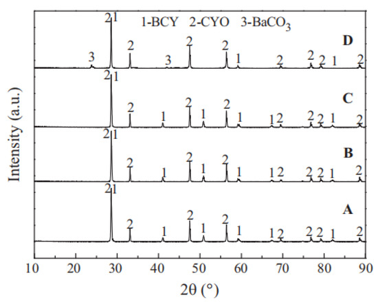 XRD patterns of BCY-CYO after the stability test in atmosphere containing 4% H2 (B), H2O (C), 100% CO2 (D); original membrane (A) [66].