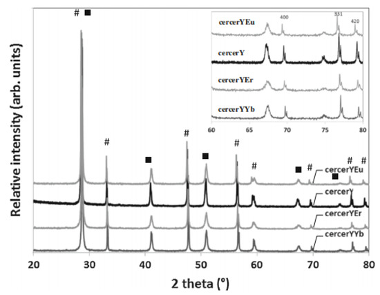 XRD of sintered cercer Y, cercer YYb, cercer YEu, and cercer YEr membranes. ■, perovskite phase; #, fluorite phase [65].