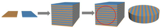 Diffusion resistance inside the membrane is one of the important factors affecting the permeability of MPEC membranes. Reducing the diffusion resistance can definitely accelerate the transport of the protons and electrons so as to improve the hydrogen flux. Whether the protonic and electronic conducting phases are combined by powder blending or automatic phase separation, the two phases are distributed randomly inside the membrane and the transport routes of the protons and electrons are flexuous, much longer than the membrane thickness. To decrease the diffusion resistance inside the membrane, Meng et al. designed an independently distributed dual-phase membrane via tape-casting technology. As shown in Figure 11, both protonic conductor SrCe0.9Y0.1O3 (SCY) and electronic conductor Ce0.8Sm0.2O2 (SDC) were cast into thin film layers and the two layers were alternately stacked into a block; the block was cut along the cross-section into thin slices, and then the dual-phase membranes were obtained via uniaxial pressing and sintering the thin slices. Short-circuit pathways were formed along with the longitudinal direction of the membrane; the diffusion paths of protons and electrons were largely decreased and the interface between the two phases was remarkably reduced (Figure 12). As a result, the membrane showed excellent hydrogen permeability, significantly higher than the SCY-SDC membrane prepared by conventional single synthesis [74].