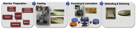 Besides composition optimization, configuration optimization is also an alternative method to enhance the performance of hydrogen permeation membranes. Asymmetric configuration is widely used for single-phase membranes to pursue higher hydrogen flux. With the support of the porous layer, the membrane dense layer can be made as thin as possible, decreasing the bulk diffusion resistance significantly. Similarly, composite membranes with asymmetric configuration are also developed to gain higher hydrogen permeability (listed in Table 1 and Table 2). In order to reduce the inter-phase reaction and thermal expansion mismatch, the dense and support layers of the asymmetric dual-phase membrane usually use similar materials. Additionally, the porous structure of the support layer is usually made through the combustion of the pore-forming agent such as activated charcoal or cornstarch. The fabrication methods of the asymmetric dual-phase membrane include dry pressing, tape casting, dip-coating, and coextrusion. Using tape a casting technique, Mercadelli et al. prepared an asymmetric dual-phase membrane using dense BaCe0.65Zr0.2Y0.15O3-δ-Ce0.8Gd0.2O2-δ (BCZY-GDC) as the separation layer and BCZY-GDC with a porous structure as the support layer [69]. Rice starch was used as the pore former in the support layer, and the sintering performance of the membrane was improved by ZnO. The preparation conditions of the support layer were optimized from the amount of rice starch, organic content, and solid loading. Green discs of the dense and support layer were stacked to a BCZY-GDC bilayer, and then the asymmetrical BCZY-GDC membranes were formed through a press-and-sintering process. The dense layer thickness was as low as 20 µm that made the membrane possess higher hydrogen permeability than most of the all-ceramic membranes. The schematic representation of the tape casting process preparing asymmetric membrane is presented in Figure 13.