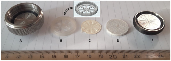Assembly of the fiber holder consisting of a commercial in-line filter (A–F), nanofibrous sorbent (C), a fused deposition modelling 3D-printed holder ((B), design shown in box) allowing the insertion of the nanofiber mats and a commercial felt pad as support of low flow resistance.