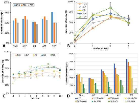 An increase in the extraction efficiency was the main objective of all following experiments. The amount of the sorbent, or rather the number of nanofiber layers, was considered to have a substantial effect on the method sensitivity and extraction efficiency particularly in terms of the extraction capacity considering the short contact time of the analytes with the sorbent. Results achieved with stacks of three, six, and nine PID layers were compared with an extraction carried out with the felt pad alone, i.e., without any PID layer (Figure 4B). The extraction recovery increased up to six layers, achieving values between 58% (CLT) and 85% (TCP), whereas nine layers yielded only similar results to those using a mere three layers. We assume that the reason for this phenomenon is a reduced penetration of both sample and eluent through the fibrous layers that decreases the accessibility of the fiber surface as well as delayed elution of the analytes from the larger mass of fibers. Therefore, six layers were used in further experiments.