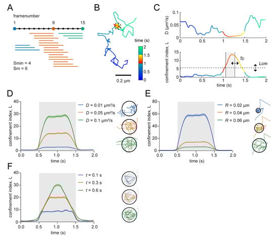 High values of L are thus indicative of non-random confinement and L = 0 in cases of random diffusion. The calculation of L is inherently based on a number of variables that will influence the detection power of the confinement analysis. To correctly interpret the results of this analysis, here we aimed to understand the influence of these different variables on the detection power of the analysis. The analysis in this study is based on the MATLAB implementation from Ménchon et al. [21] with some modifications (see Section 2.8; Figure S2). To define the confinement index over time for individual trajectories, a trajectory is first divided into segments with minimum length Smin and maximum length Sm (Figure 1A) and for each individual segment, L is calculated as described above. As such, these parameters are thus expected to determine the spatial and temporal sensitivity of the analysis. The radius R of the segment is defined by the maximum distance between one of the points and the starting point of the segment. The diffusion coefficient D used in the formula is the same for all the segments in the trajectory and should represent the diffusion coefficient of the molecule if it would move freely. Then, for each point in the trajectory, L is averaged over all the segments that include that point. Note, that as a consequence, the averaged L for points at the beginning and the end of the track is averaged over fewer segments than points in the middle. As can be seen for a simulated trajectory with a short period of transient confinement (Figure 1B), L values are higher during the confined period, which is accompanied by a temporal decrease in the diffusion coefficient (Figure 1C). Confined periods within a trajectory can then be defined by selecting periods in which all points are above the critical minimum L (Lcm) for a duration longer than a critical period of time (Tc) (Figure 1C).