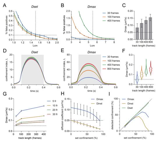 Effect of diffusion coefficient in the confinement index formula on confinement detection. (A,B) Effect of track length on the percentage of false positives in random walks using Dset (A) or Dmax (B) as diffusion coefficient in the confinement index formula. Five independent simulations of 1000 trajectories per condition. Data are represented as means ± SEM. (C) Effect of track length on Dmax. One hundred simulated random walks per condition. Data are represented as means ± SD. (D,E) Effect of track length on the confinement index over time using Dset (D) or Dmax (E) as diffusion coefficient in the confinement index formula. 100 confined trajectories per condition, Rconf = 0.02 μm. Data are represented as means ± SEM. (F) Violin plots of Dmax values from (E). (G) Effect of the length of the segments used for estimating Dinst within trajectories on Dmax. (H) Effect of the percentage of confinement within a trajectory on the estimated diffusion coefficient of the whole trajectory (Dinst) or the Dmax. One thousand trajectories per condition, Rconf = 0.04 μm. Data are represented as means ± SD. (I) Effect of the percentage of confinement within a trajectory on the detected confinement within the trajectory using Dmax, Dinst or Dset. Dotted line indicates set confinement = detected confinement. One thousand trajectories per condition, Rconf = 0.04 μm.