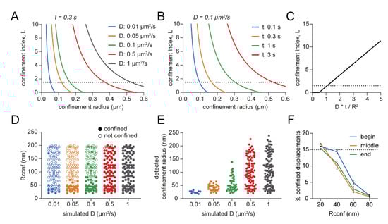 Several studies have reported on strategies to analyze and detect confined behavior in single-molecule trajectories [11,12,13,14,15,16,17,18]. In fact, Einstein formulated a theory about Brownian diffusants already in 1905, where he argued that the displacement of a Brownian particle is proportional to the square root of the elapsed time [19]. Confinement is defined as the portion of a trajectory that deviates from what a random walk would look like. Therefore, it is essential to know how long a Brownian diffusant would stay in a certain region. Saxton defined the probability that a molecule will stay in a region by the following equation: where D is the diffusion coefficient, t the period of time, and R the radius of the region [20]. Simson et al. translated this probability into the confinement index, which is inversely related to the probability that a Brownian molecule will stay in a certain area [11]. When this probability during the trajectory becomes lower, the confinement index will increase, indicating a period of transient confinement within the trajectory. This confinement analysis has been used extensively by many labs to detect temporal confinement in single-molecule trajectories [21,22,23,24,25,26,27,28,29,30,31,32,33].