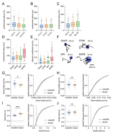 Confinement analysis on experimental trajectories. (A–C) Effect of user-defined parameters on the detected confinement radius. (A) Vary critical L, Lcm. Number of trajectories with confinement: Lcm 3: 381, Lcm 4: 309, Lcm 5.5: 219. (B) Vary critical time, Tc. Number of trajectories with confinement: Tc 0.1: 311, Tc 0.2: 219, Tc 0.3: 139. (C) Vary maximum segment length, Sm. Number of trajectories with confinement: Sm 5: 181, Sm 15: 219, Sm 30: 177. (D–F) Confinement zones detected for membrane probes: GluA1, GT46, GPI, and DOPE. (D) Detected confinement radius for each probe. (E) Estimated diffusion coefficients for each probe. (F) Example trajectories with their detected confinement zone. Interval times during the acquisition are indicated. Scale bar, 200 nm. (G–J) (G) Average estimated diffusion coefficient inside confinement zones, (H) average estimated diffusion coefficient outside confinement zones, (I) average dwell time, (J) average total track length for mGluR5 (n = 20) and GluA2 (n = 17; unpaired t-test) (left), and corresponding cumulative frequency distribution (right). (I) Dotted line indicates dwell time threshold. (J) Dotted line indicates minimum track length threshold. Data are represented as means ± SEM. * p < 0.05, *** p < 0.001, ns, p > 0.05.