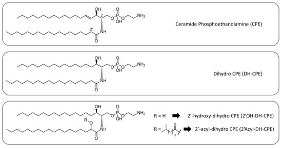 Ceramide phosphoethanolamine (CPE) is a major sphingolipid in the cell membranes of arthropods [31,32,33] and is also found in marine animals [34,35], some invertebrates [36,37,38], protozoa [39,40] and oomycetes [41]. Trace amounts of CPE can also be detected in mammalian cells (0.002–0.005% of all phospholipids), with the highest levels found in the testis and brain [42,43]. Lipidomic analyses have already shown the presence of CPE as well as its dihydrogenated form, dihydroceramide phosphoethanolamine (DH-CPE), in bacteria of the phylum Bacteroidetes [44,45] and also in dental plaque of patients with periodontal disease [46].